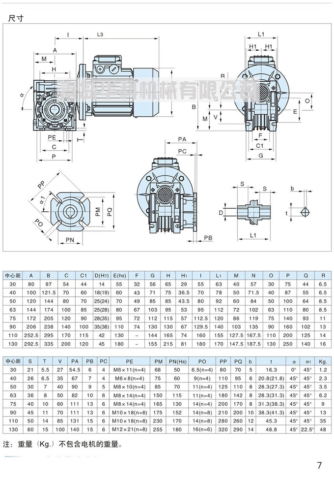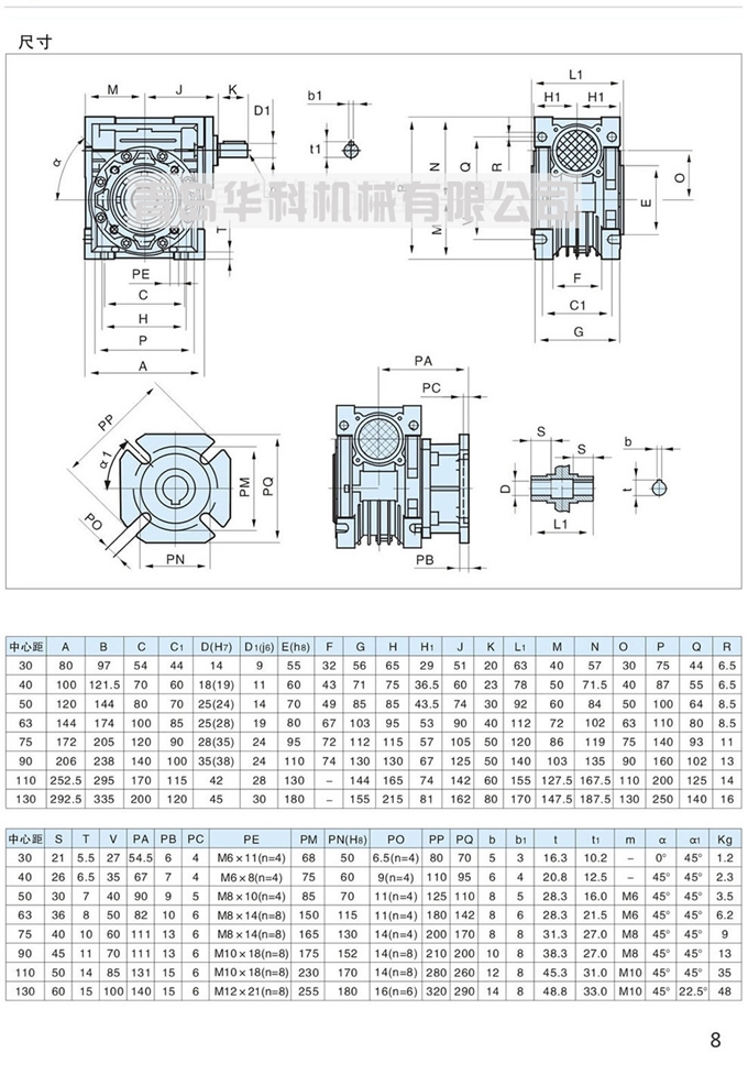 单级RV蜗轮蜗杆减速机的安装尺寸,包括有电机输入时的尺寸,单轴输入时的尺寸,孔输出尺寸,法兰输出时尺寸.如果有不了解的地方,可来电咨询.