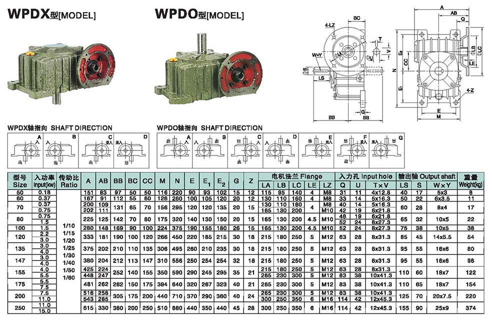 WPDO与WPDX减速机的外形尺寸及安装尺寸,WPDO与WPDX减速机法兰输入,轴输出.WPDO与WPDX减速机轴指向表示方法.机座号从40到250,可选速比从10到60.WPDO与WPDX系列蜗轮蜗杆减速机选型指南