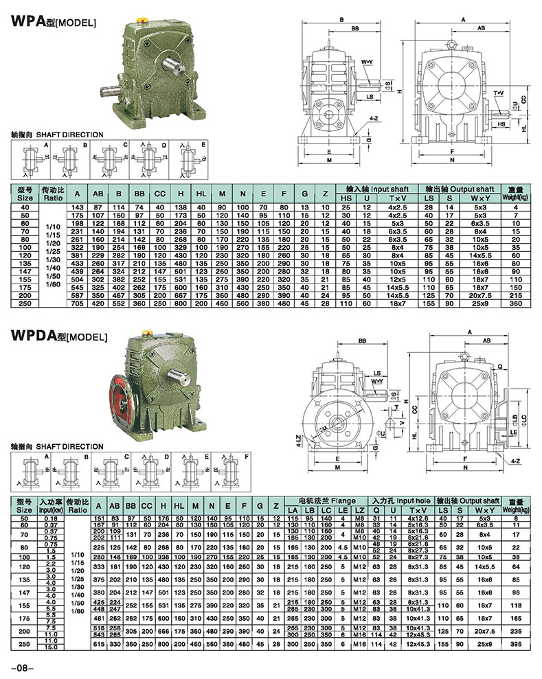 WPA系列蜗轮蜗杆减速机的外形尺寸及安装尺寸,WPA减速机轴输入,轴输出.WPA减速机轴指向表示方法.机座号从40到250,可选速比从10到60.WPA系列蜗轮蜗杆减速机选型指南,选型方法