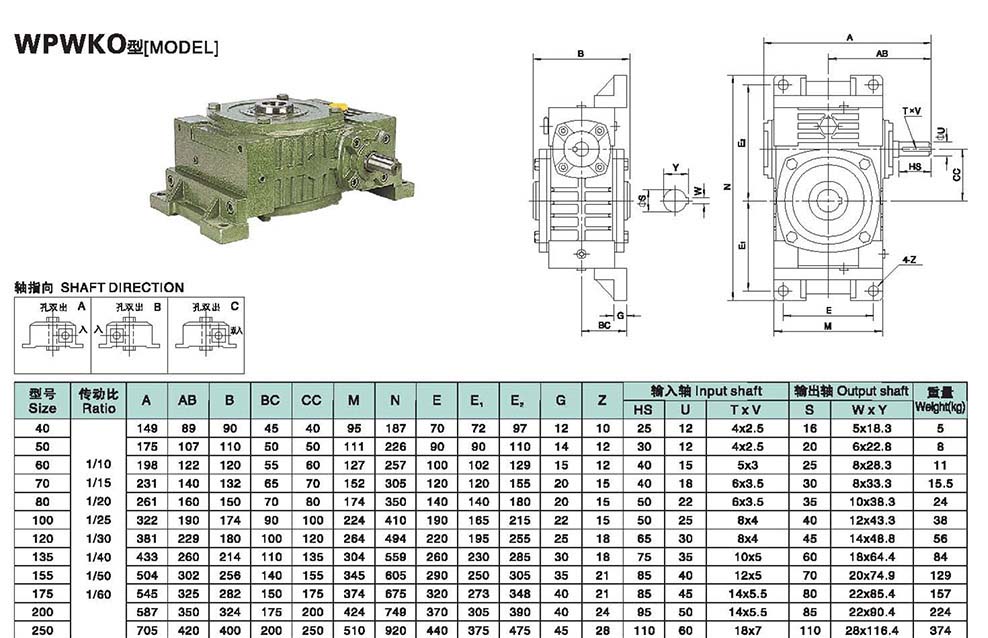 WPWKO万能型蜗轮蜗杆减速机选型指南,WPWKO万能型减速机轴输入,孔输出.WPWKO万能型减速机轴指向表示方法.机座号40到250,速比10到60.WPWKO减速机的外形安装尺寸。