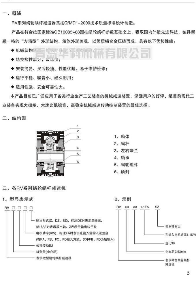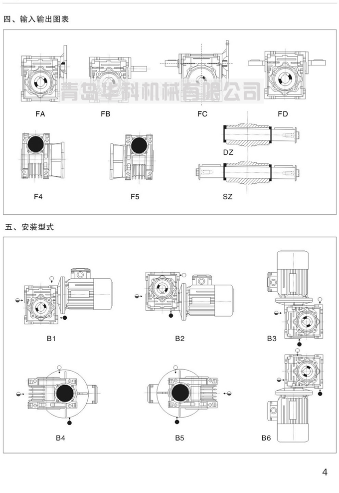 RV系列减速机产品概述及结构图,输入输出结构图表(FA,FB,FC,FD,F4,F5,DZ,SZ),安装形式(B1,B2,B3,B4,B5,B6)
