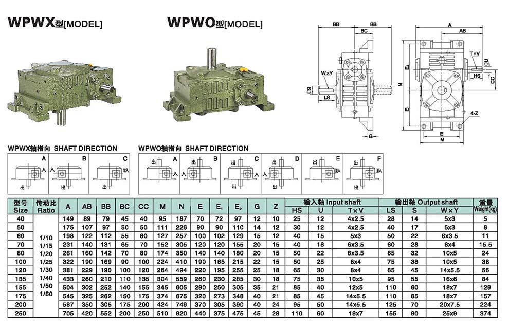 WPWX与WPWO系列万能型蜗轮蜗杆减速机选型指南,WPWX与WPWO减速机轴输入,轴输出.机座号40到250,速比10到60.WPWX与WPWO万能型减速机的外形尺寸及安装尺寸