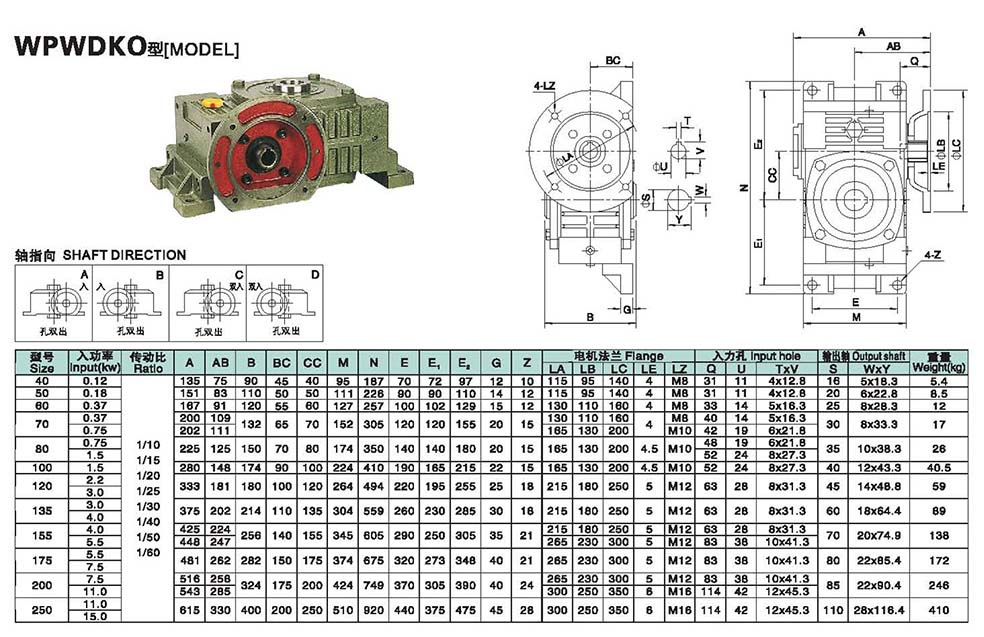 WPWDKO万能型蜗轮蜗杆减速机选型指南,WPWDKO万能型减速机法兰输入,孔输出.WPWDKO万能型减速机轴指向表示方法.机座号40到250,速比10到60.WPWDKO减速机的外形安装尺寸