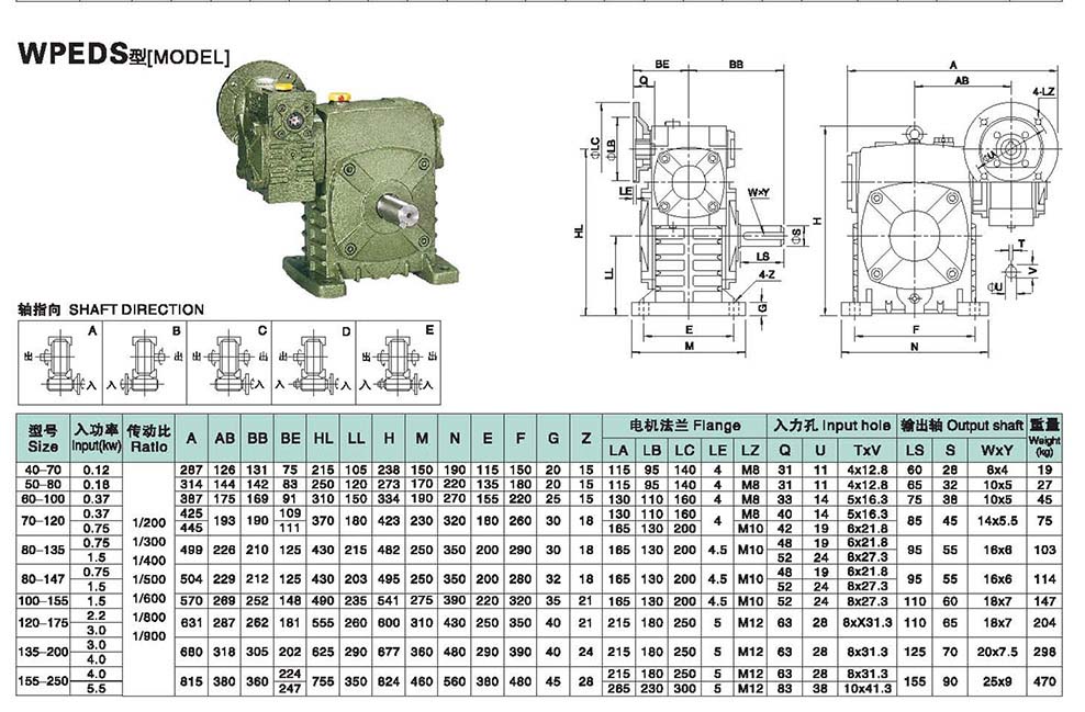 WPEDS双级减速机的外形安装尺寸.WPEDS双级蜗轮蜗杆减速机选型指南,WPEDS双级减速机法兰输入,轴输出.WPEDS双级减速机轴指向表示方法.机座号40-70到155-250,速比200到900.