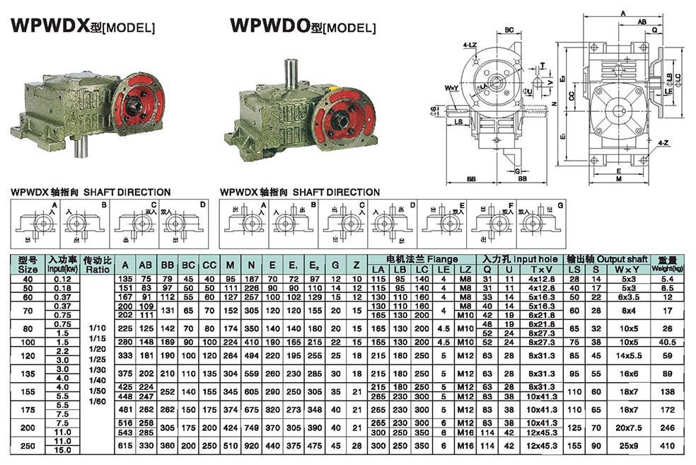 WPWDX与WPWDO蜗轮蜗杆减速机选型指南,WPWDX与WPWDO万能型减速机法兰输入,轴输出.WPWDX与WPWDO减速机轴指向表示方法.机座号40到250,速比10到60.WPWDX与WPWDO减速机的外形尺寸及安装尺寸