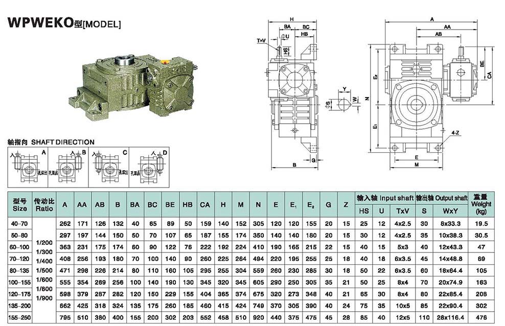 WPWEKO双级万能型蜗轮蜗杆减速机选型指南,WPWEKO双级减速机轴输入,孔输出.WPWEKO万能型减速机轴指向表示方法.机座号40-70到155250,速比200到900.WPWEKO减速机的外形安装尺寸