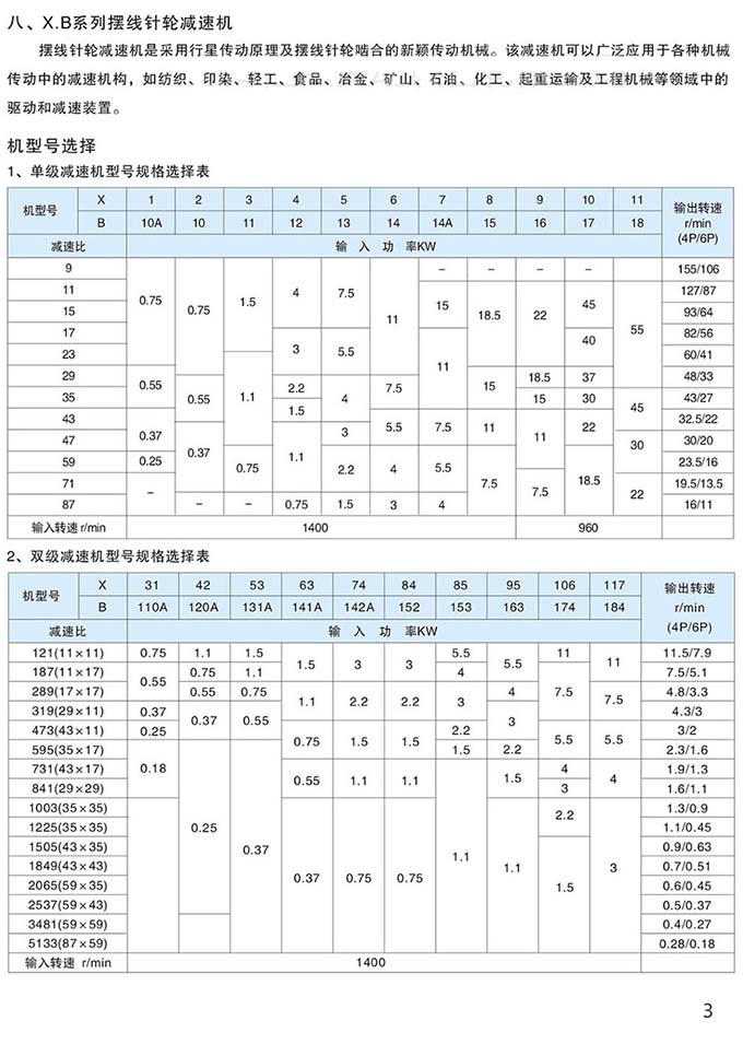 单级,双级摆线减速机型号规格选择表 - X/B系列摆线针轮减速机