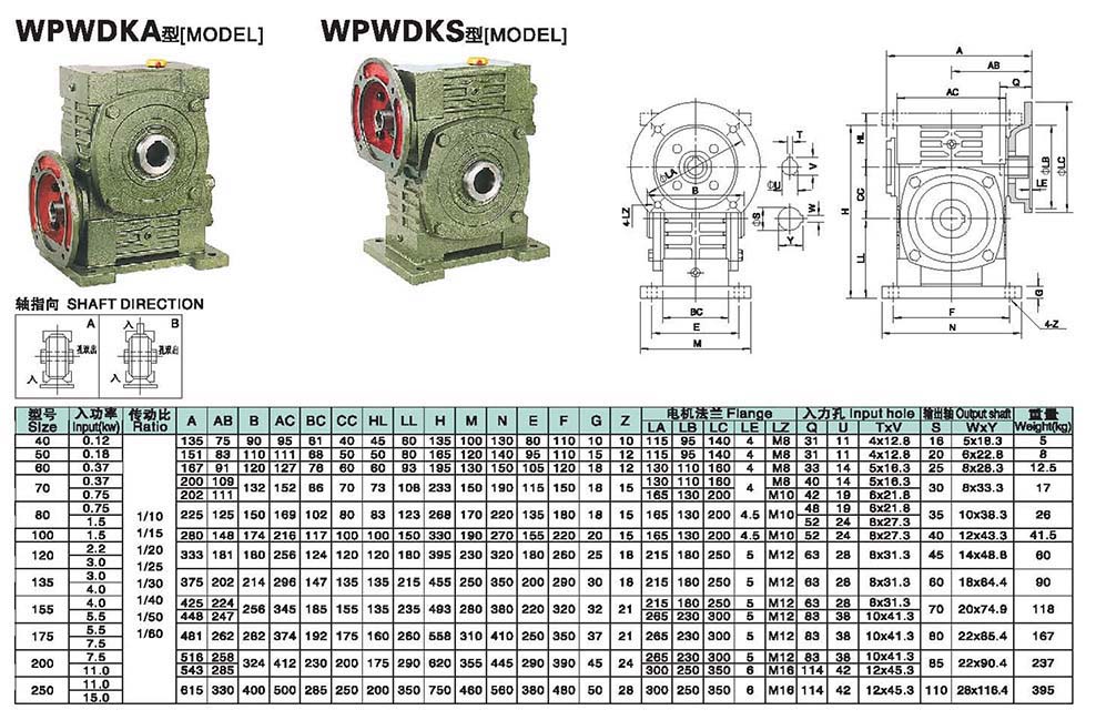 WPWDKA与WPWDKS系列万能型蜗轮蜗杆减速机选型指南,WPWDKA与WPWDKS型减速机轴指向表示方法.机座号40到250,速比10到60.WPWDKA与WPWDKS减速机的外形尺寸及安装尺寸