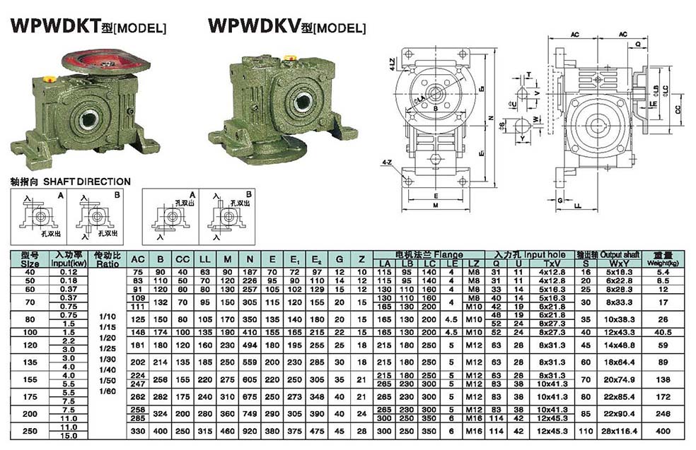 WPWDKT与WPWDKV万能型蜗轮蜗杆减速机选型指南,WPWDKT与WPWDKV万能型减速机轴输入,轴输出.机座号40到250,速比10到60.WPWDKT与WPWDKV减速机的外形安装尺寸