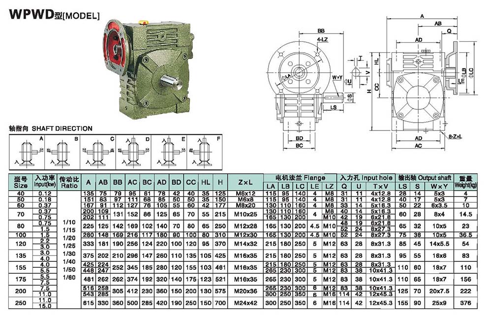 WPWD系列万能型蜗轮蜗杆减速机选型指南,WPWD减速机轴输入,轴输出.WPWD万能型减速机轴指向表示方法.机座号40到250,速比10到60.WPWD万能型减速机的外形尺寸及安装尺寸。