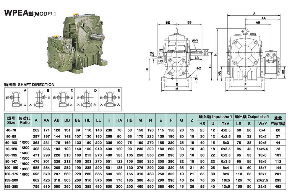 WPEA双级减速机的外形安装尺寸.WPEA双级蜗轮蜗杆减速机选型指南,WPEA双级减速机轴输入,轴输出.WPEA双级减速机轴指向表示方法.机座号40-70到155-250,速比200到900.