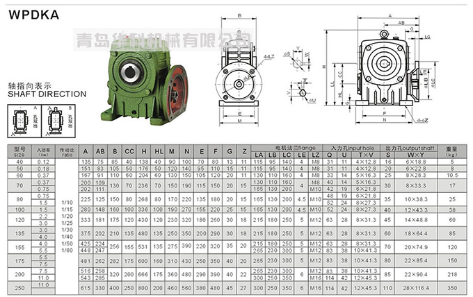 WPDKA系列蜗轮蜗杆减速机的外形尺寸及安装尺寸,WPDKA减速机轴指向表示方法.WPDKA减速机法兰输入,孔输出,机座号从40到250,可选速比从10到60.WPDKA系列蜗轮蜗杆减速机选型指南,选型方法