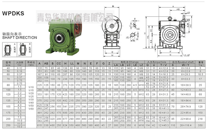 WPDKS蜗轮蜗杆减速机的外形尺寸及安装尺寸,WPDKS减速机法兰输入,轴输出.WPDKS减速机轴指向表示方法.机座号从40到250,可选速比从10到60.WPDKS系列蜗轮蜗杆减速机选型指南