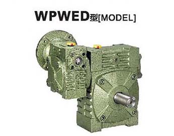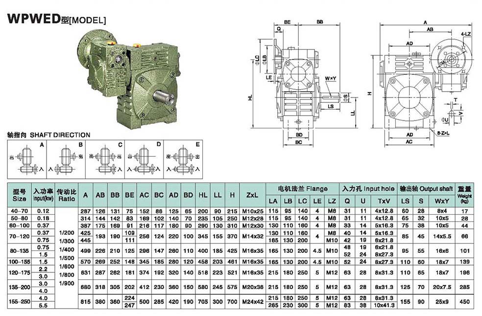WPWED双级万能减速机的外形安装尺寸.WPWED双级蜗轮蜗杆减速机选型指南,WPWED双级减速机法兰输入,轴输出.WPWED双级减速机轴指向表示方法.机座号40-70到155-250,速比200到900.