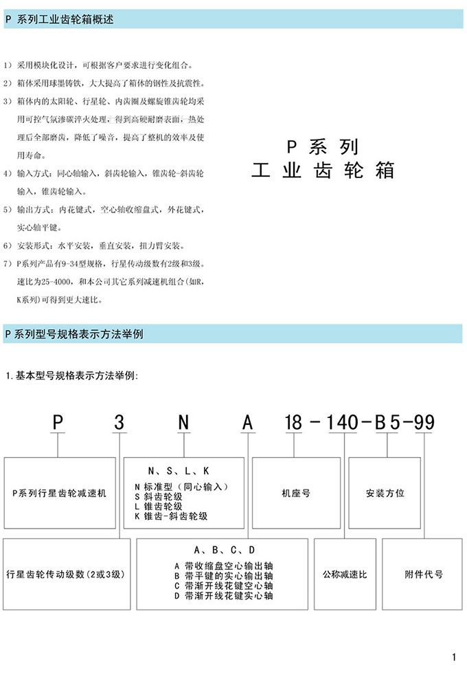 P系列行星齿轮减速器采用模块化设计,箱体采用球墨铸铁,箱体内的太阳轮,行星轮,内齿圈及螺旋锥齿轮采用气氛淬火处理.P系列行星齿轮减速器有同心轴输入,斜齿轮输入,锥齿轮-斜齿轮输入,锥齿轮输入.