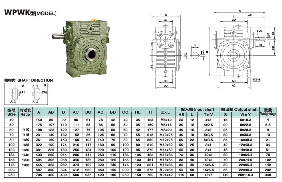 WPWK万能型减速机的外形尺寸及安装尺寸.WPWK系列万能型蜗轮蜗杆减速机选型指南,WPWK万能型减速机轴输入,轴输出.WPWK万能型减速机轴指向表示方法.机座号40到250,速比10到60.