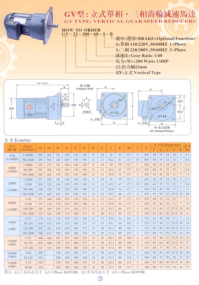 GV立式齿轮减速电机的型号表示方式,GV立式小齿轮减速机马达的外形尺寸表,具体型号: GV18,GV22,GV28,GV32,GV40,GV50; 可配电机功率: 75W(1/10HP),100W(1/8HP),200W(1/4HP),400W(1/2HP),750W(1HP),1500W(2HP),2200W(3HP),3700W(5HP)