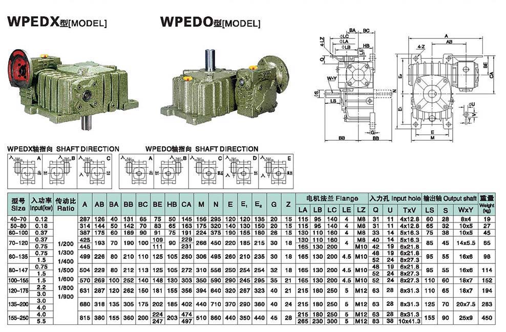 WPEDX与WPEDO双级减速机的外形安装尺寸.WPEDX与WPEDO双级蜗轮蜗杆减速机选型指南,WPEDX与WPEDO双级减速机法兰输入,轴输出.WPEDX与WPEDO双级减速机轴指向表示方法.机座号40-70到155-250,速比200到900.